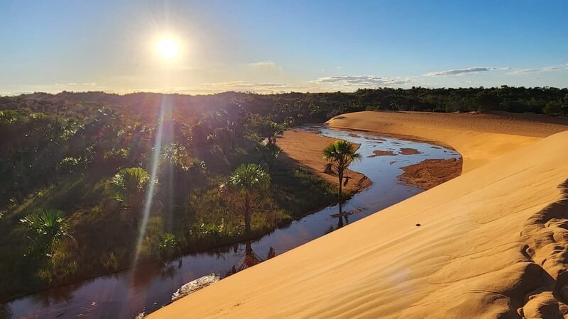 DUNAS DO JALAPÃO – Pós rápido descanso no redário, partimos passando pelo Rio Novo, rumo a Serra do Espírito Santo, uma chapada que tem aproximadamente 300 metros de altura e 22 quilômetros de extensão. A próxima parada aconteceu nas Dunas do Jalapão, uma das principais atrações do Parque Estadual do Jalapão, retratada na foto que abre a matéria. Na chegada existe todo um ritual, visto que constantemente existe uma fila de turistas organizadas por caminhonetes, para produzir a emblemática foto da entrada do parque. Mas a espera não é problema, já que se faz dentro de um agradável bar que conta com boa música e serve drinks maravilhosos. Segundo o guia turístico Maycon Kener Almeida, “as dunas do Jalapão são consideradas as maiores e únicas dunas do cerrado brasileiro. Uma das paisagens mais belas do Jalapão, onde é possível ver areia dourada, vegetação com as palmeiras Buriti e água junto. Um cenário completo e perfeito!”